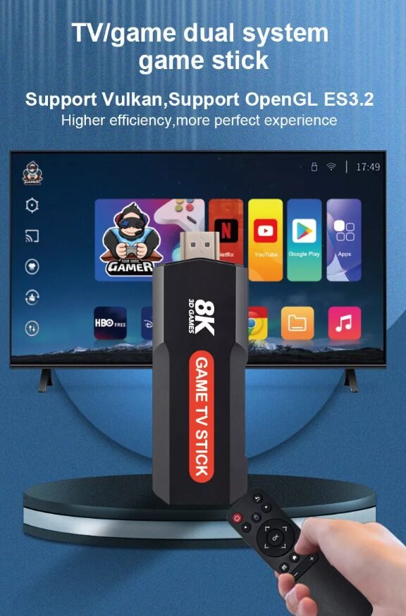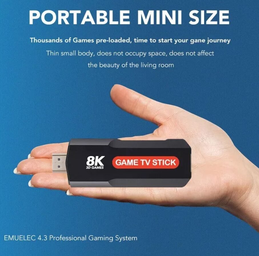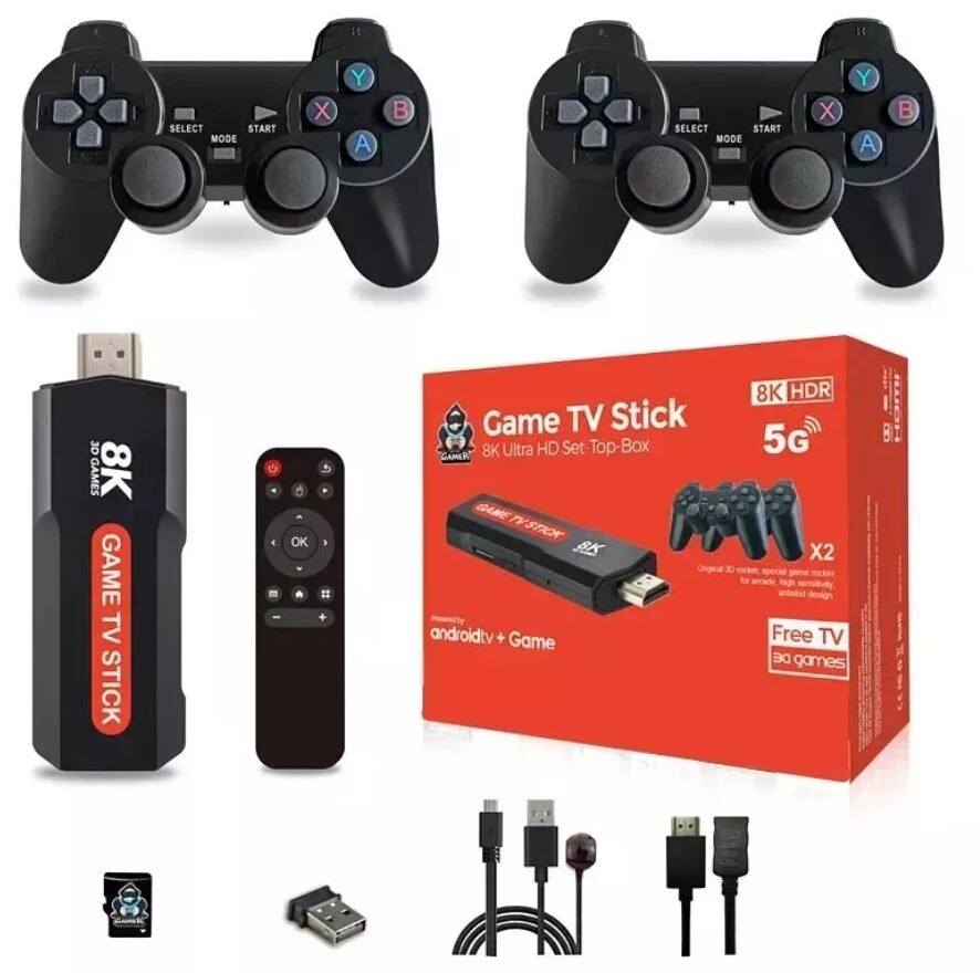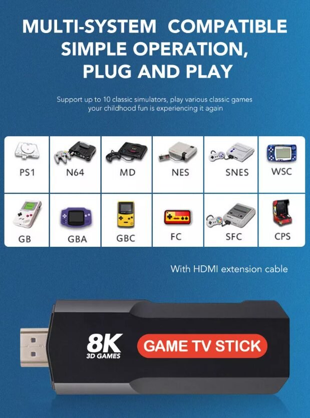Game TV Stick، الجهاز المثالي لعشاق الألعاب والمحتوى الذكي. يحتوي هذا الجهاز الصغير على أكثر من 10000 لعبة كلاسيكية تغطي أشهر منصات الألعاب مثل PS1، NES، MAME، وغيرها، مع إمكانية اللعب مباشرة على أي شاشة تحتوي على منفذ HDMI.